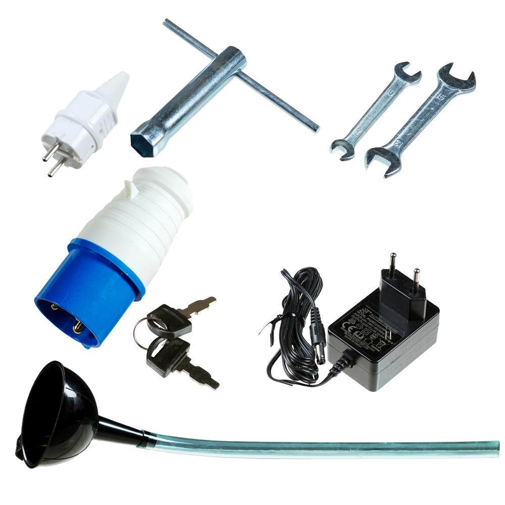 | вилка 230В/32А (1 шт) , вилка типа евро 230В/16А (1 шт), свечной ключ с воротком (1 шт) , заливная воронка (1 шт), колеса (2 шт), рукоятки (2 шт), подпятник (2 шт), крепеж для колес и рукояток, ключ зажигания (2 шт) , провода для выхода 12В, ключ 8/10 (1 шт) , ключ 13/15 (1 шт), зарядное устройство для аккумулятора, провода для зарядки аккумулятора , инструкция с сервисным талоном и серийным номером |