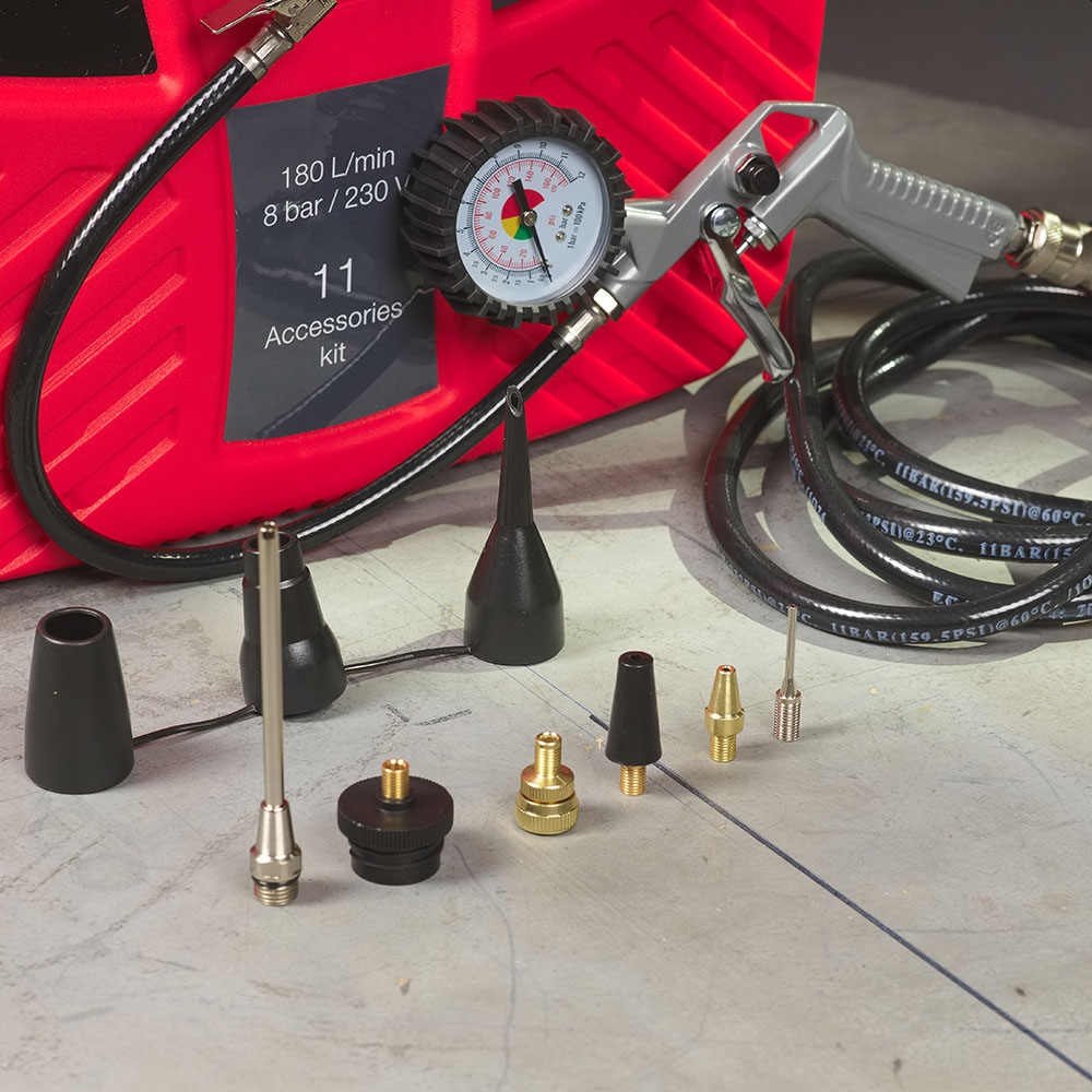 Все входящие в набор пневмоинструменты и аксессуары компактно размещены в специальных отсеках пластикового корпуса компрессора, что делает использование, переноску и хранение этого набора максимально простым и удобным. Может перевозиться как вертикальном, так и в горизонтальном положениях.