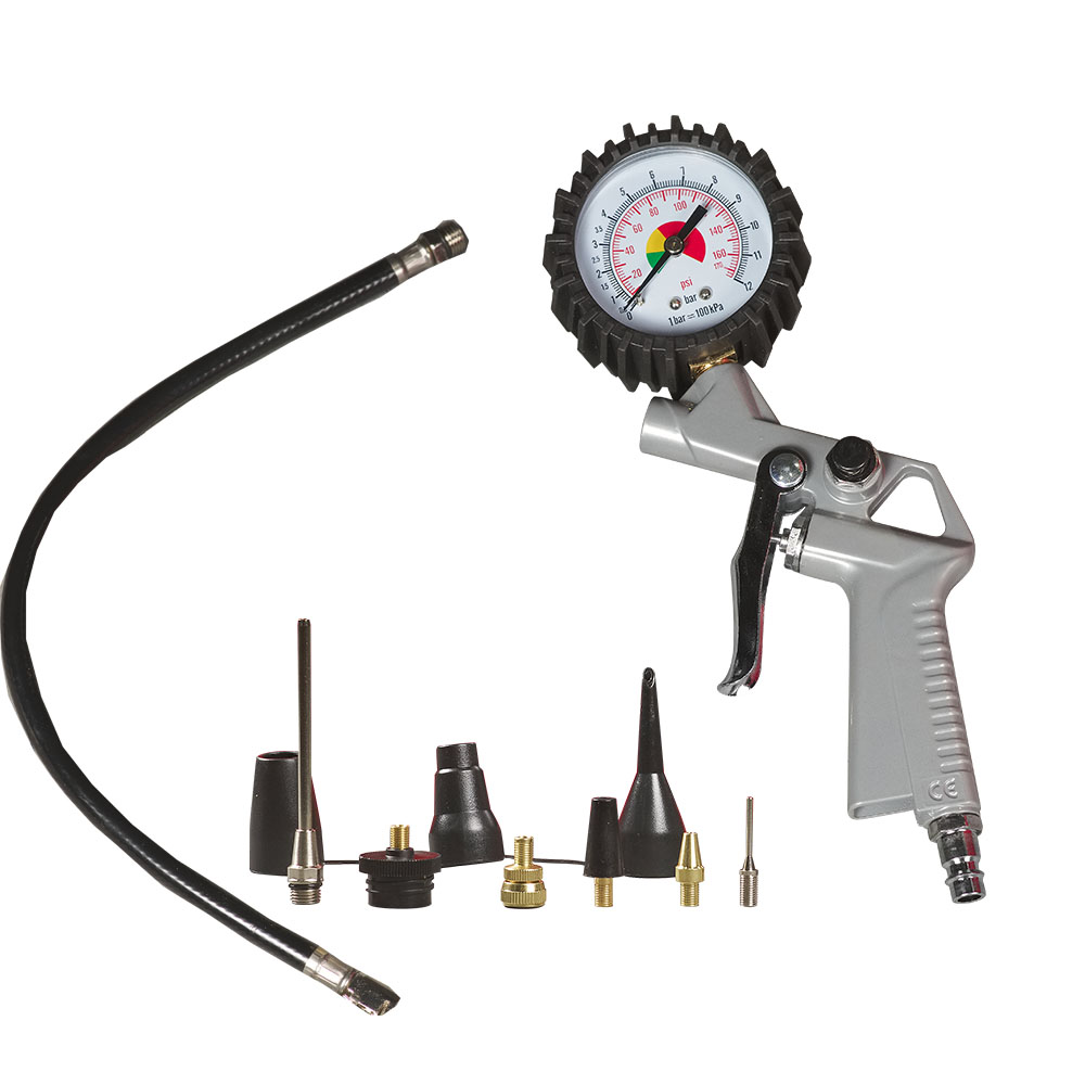 | Пневмопистолет с манометром для накачки, Удлиненная насадка для продувки, Игла для накачки мячей, Универсальный адаптер для клапанов с внутренним диаметром 6 мм, Универсальный адаптер для клапанов с внутренним диаметром 9 мм, Адаптер для накачки велосипедных шин, Насадки для накачки лодок, матрасов, бассейнов, Переходник (для насадок накачки лодок, матрасов, бассейнов), Воздушный шланг 3 м |