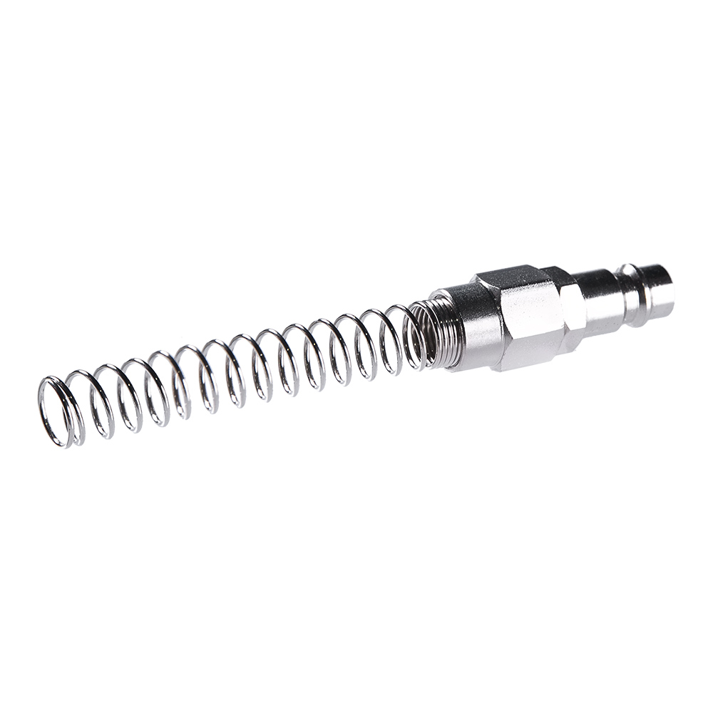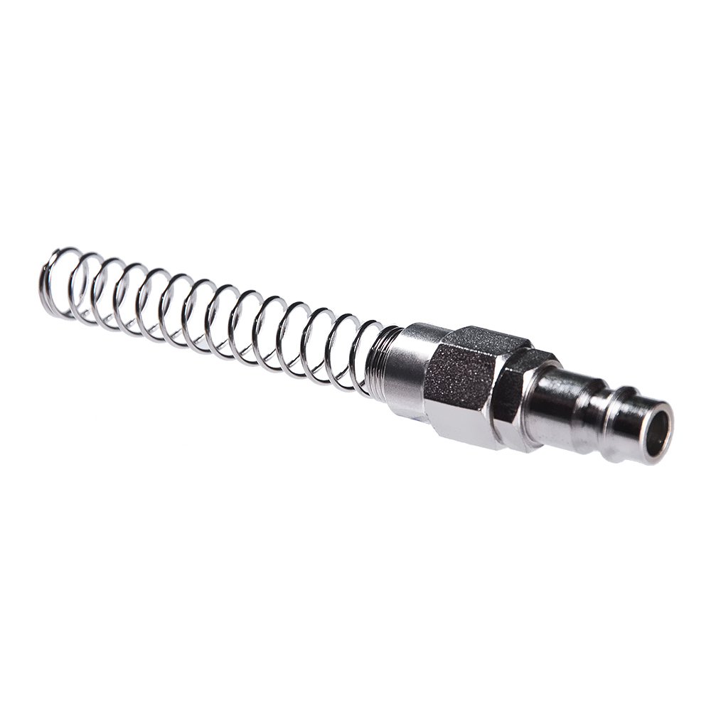 Переходник для подключения компрессора к пневмоинструменту. С одной стороны фитинг рапид папа, с другой  - пружина 8x12 мм, которая не позволяет шлангу перегибаться и деформироваться в месте соединения.