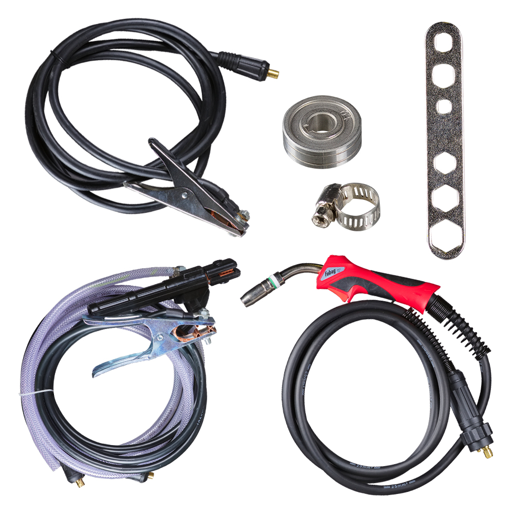 | горелка (250 А, 3 м), кабель заземления (25 мм2 х 3 м), кабель с электрододержателем (1,6 м), газовый шланг (3 м) |