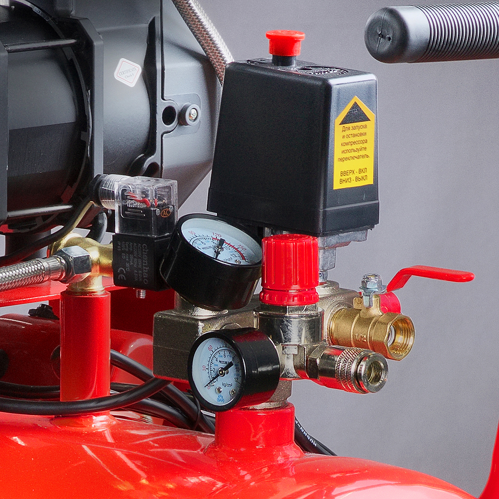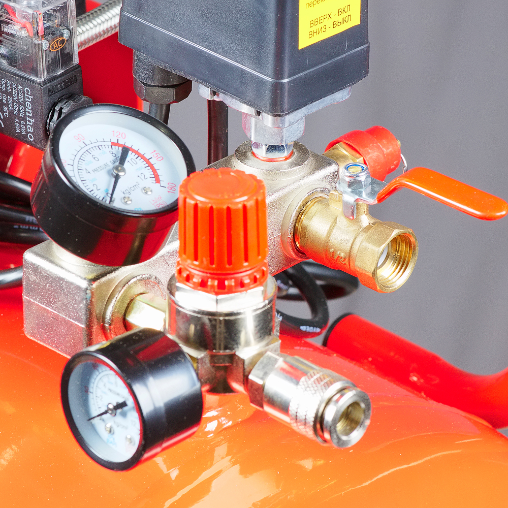 - Прессостат для поддержания заданного давления в ресивере и обеспечения повторного запуска.