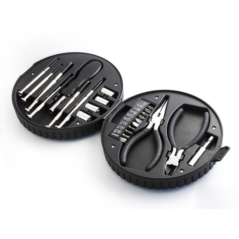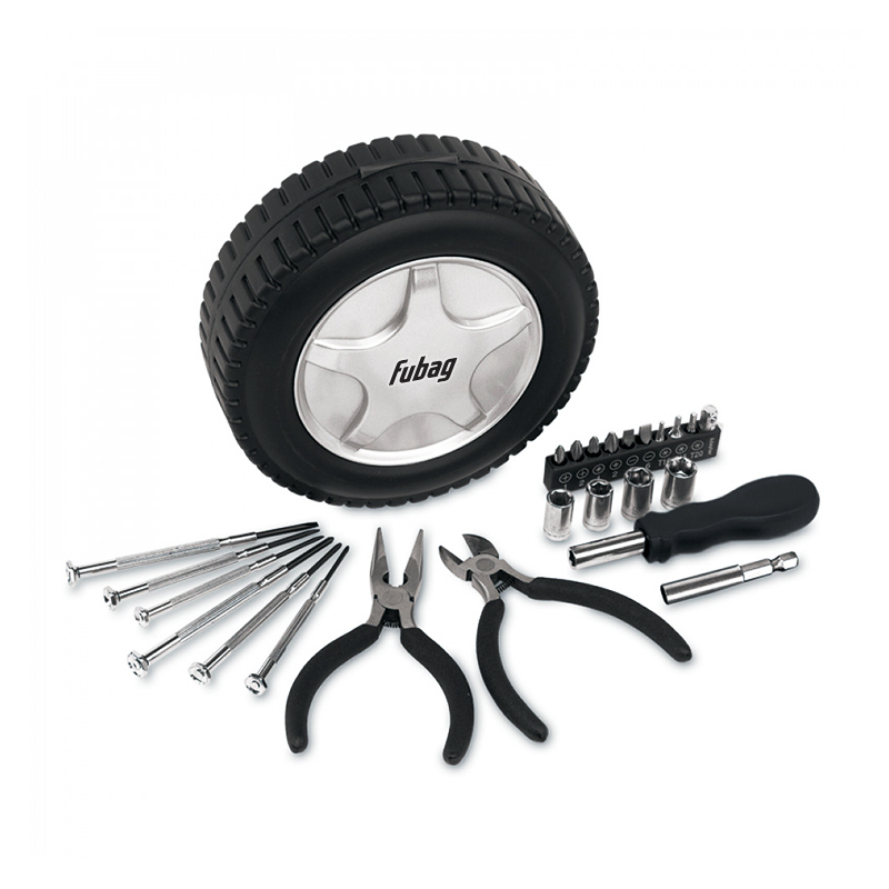 В общей сложности 24 предмета собрано в наборе инструментов и очень компактно уложено в оригинальный чехол в виде автомобильной шины.