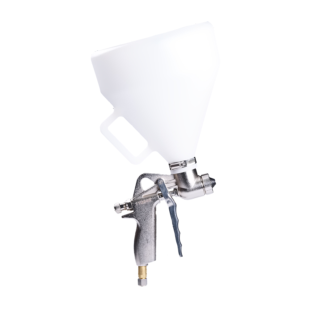 Диаметр сопел регулируется под разные диаметры фракций. Большая скорость работы. Долговечность. При использовании текстурного пистолета отсутствует вероятность отслаивания материала, поскольку смесь более однородна, чем при нанесении шпателем. Комплектация 3 сопла на 4, 6, 8 мм.