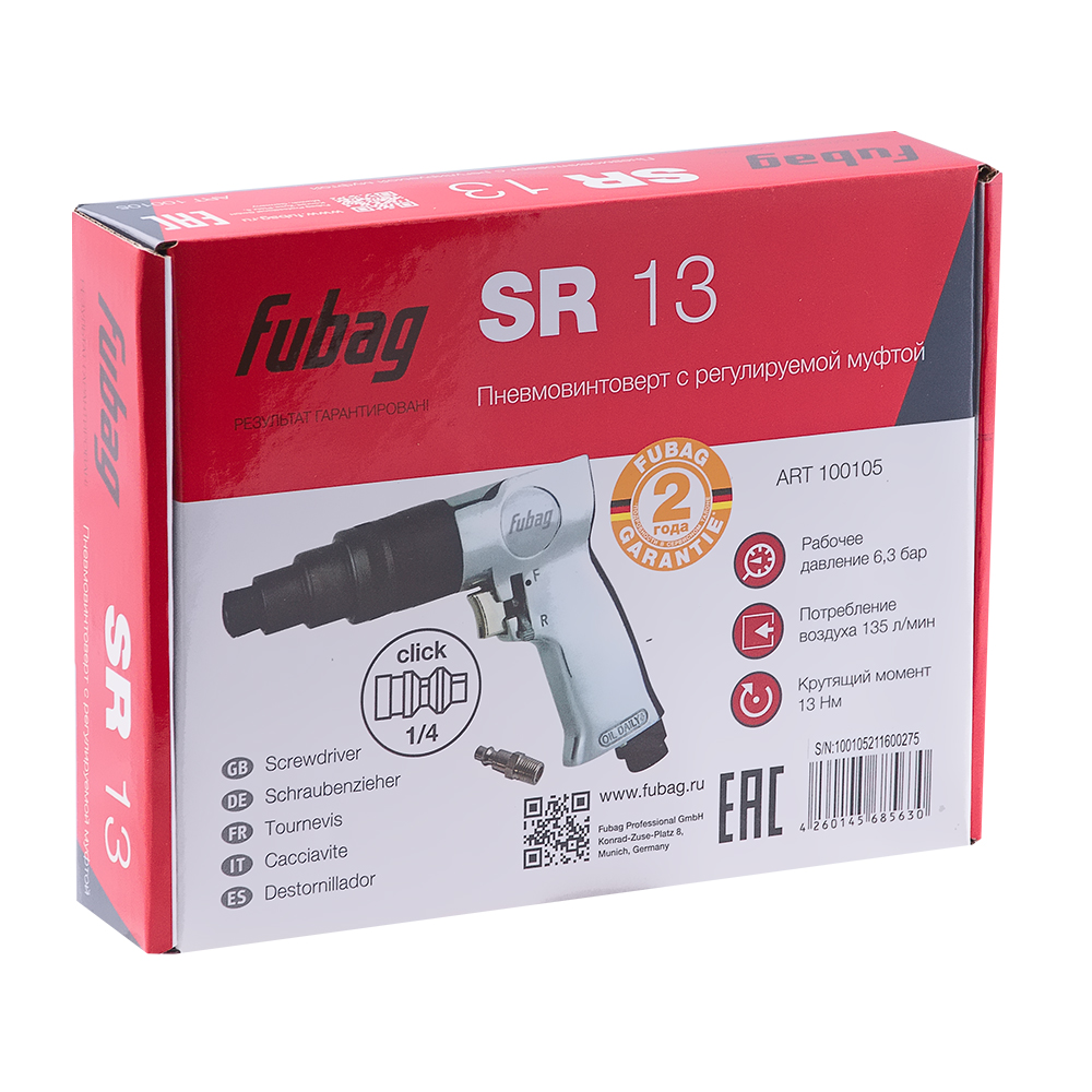 Пневмовинтоверт оснащен удобной рукояткой, которая не режет и не натирает руку.                                             Характеристики FUBAG Пневмовинтоверт SR13