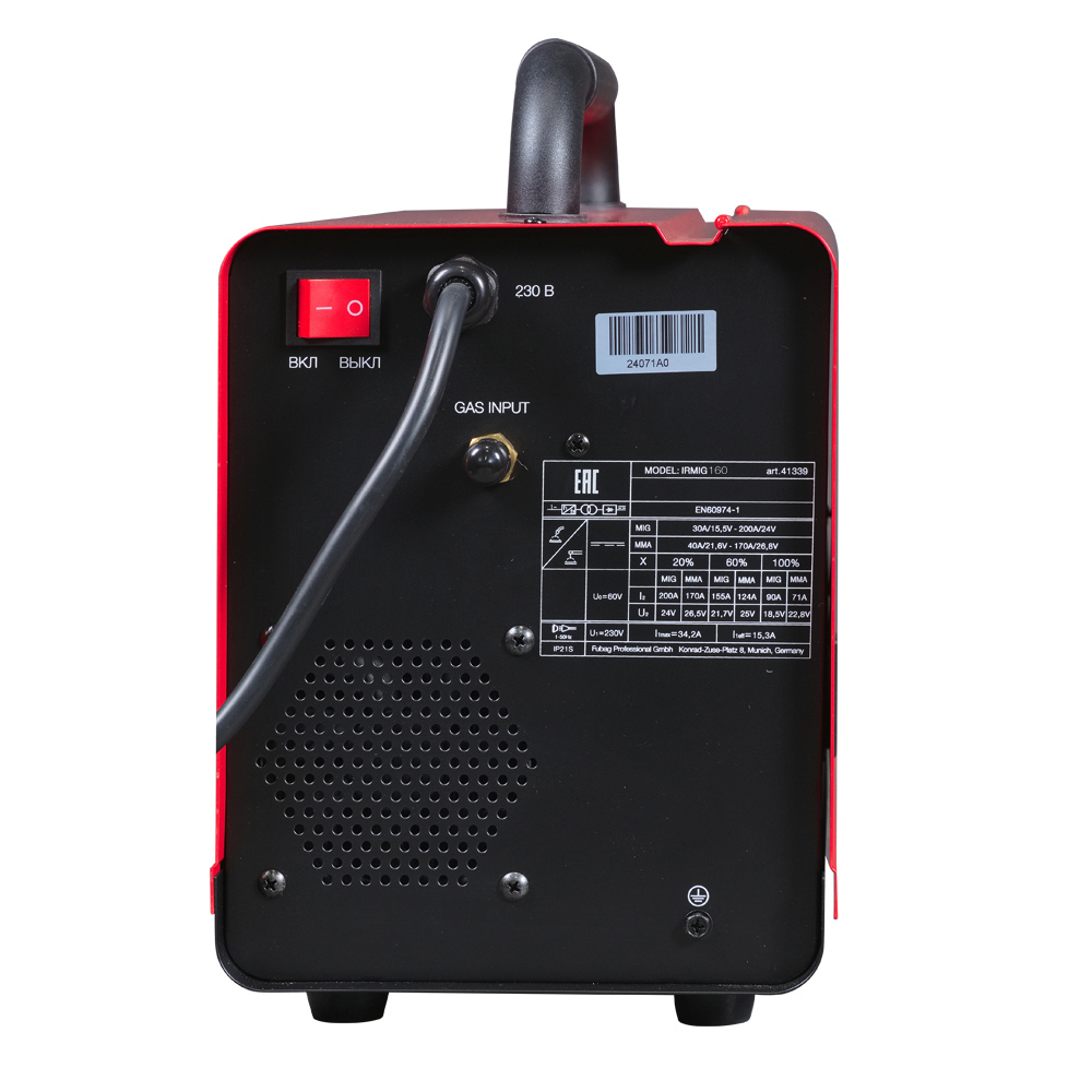 Все технические характеристики наглядно и подробно указаны на корпусе аппарата. Сварочный полуавтомат Fubag IRMIG 160 поставляется с полным набором аксессуаров для MIG/MAG и ММА сварки.