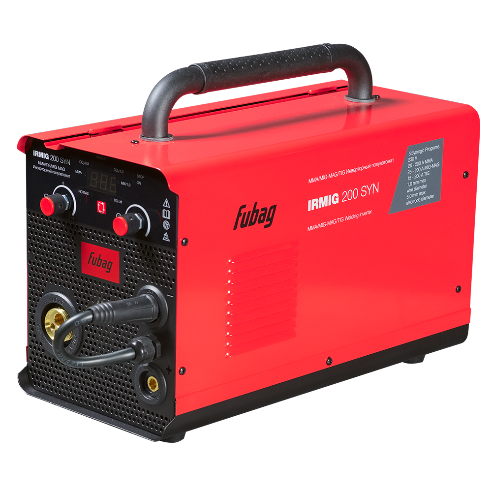 Сварочный полуавтомат Fubag IRMIG 200 SYN – высокопроизводительный сварочный аппарат. Работает в режимах MIG/MAG, MMA, TIG LIFT DC. Имеет 5 встроенных синергетический программ и функцию VRD (в режиме MMA). Оснащён 2-мя цифровыми дисплеями. Аппарат работает в самом распространенном диапазоне сварочного тока 15-200 А с проволокой диаметром от 0,6-1,0 мм, катушкой весом 5 кг и диаметром 200 мм. Высокую производительность сварочной работы обеспечивает автоматическая подача проволоки. Регулировка подачи проволоки, сварочного напряжения и индуктивности в ручном режиме позволяет настроить оптимальный режим сварки. Передняя панель оснащена регуляторами силы тока и скорости подачи проволоки, что позволяет быстро и просто выбирать режимы и оптимальные параметры сварки. Сварочный полуавтомат Fubag IRMIG 200 SYN оснащен евроразъемом для быстрого и безопасного подключения сварочной горелки. Купив сварочный инвертор IRMIG 200 SYN, вы получите в коробке фирменную горелку 250 А и газовый шланг, а также кабель с электрододержателем и кабель заземления. Продолжительность включения (ПВ) составляет 20% при 40С. Эти данные приведены в соответствии с европейским стандартом EN60974-1 при внешней температуре 40С. Часто на рынке используется значение ПВ при температуре окружающей среды 20С: чем ниже температура, тем выше ПВ. Сварочный полуавтомат Fubag IRMIG 200 SYN обладает легкой сменой полярности для работы с самозащитной проволокой. Эффективная система охлаждения, а также встроенная функция термозащиты с индикацией перегрева гарантируют долговечность и надежность использования аппарата в условиях интенсивной эксплуатации. Быстрое подключение сварочных кабелей и евроразъем для подключения горелки гарантируют удобство использования. Все технические характеристики наглядно и подробно указаны на корпусе аппарата. Сварочный полуавтомат Fubag IRMIG 200 SYN поставляется с полным набором аксессуаров для MIG/MAG и ММА сварки . В интернет-магазине fubag.ru вы можете скачать инструкцию по подключению и использованию сварочного полуавтомата Fubag IRMIG 200 SYN, а также фотографии аппарата в различных ракурсах, его характеристики и полное описание.Основные преимущества полуавтомата сварочного FUBAG IRMIG 200 SYN