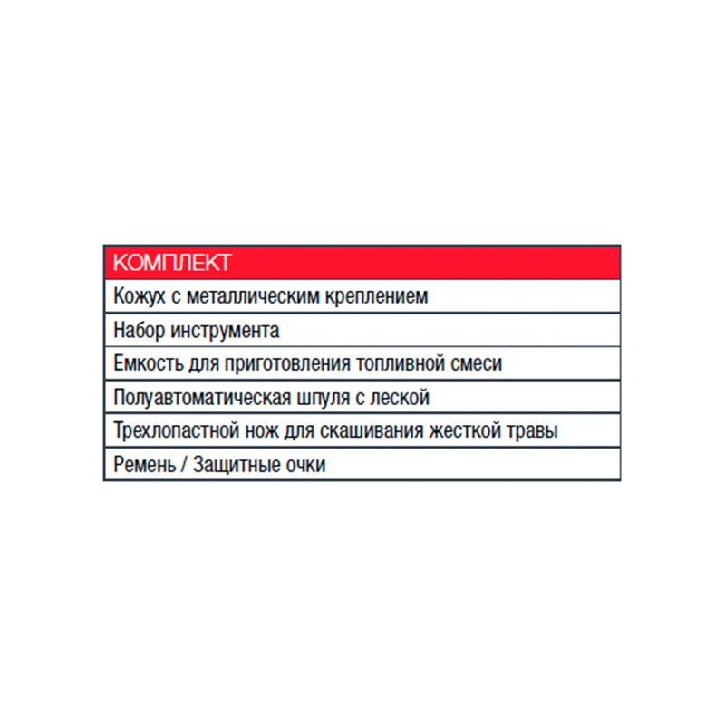 | Кожух с металлическим креплением, Набор инструмента, Емкость для приготовления топливной смеси, Полуавтоматическая шпуля (облегченная заправка) с леской (посадка М10-1,25 мм) , Трехлопастной стальной нож для скашивания жесткой травы, Ремень/ защитные очки |