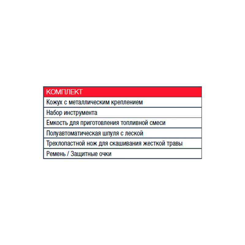 | Кожух с металлическим креплением, Набор инструмента, Емкость для приготовления топливной смеси, Полуавтоматическая шпуля с леской, Трехлопастной нож для скашивания жесткой травы, Ремень / Защитные очки |