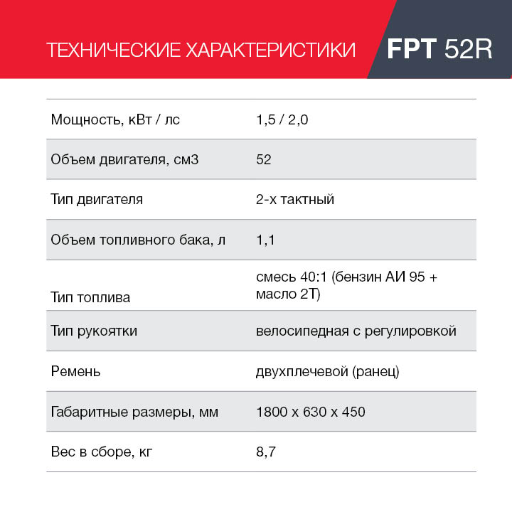 Характеристики FUBAG Бензиновый триммер FPT 52R + Триммерная леска  сечение витой квадрат L 130 м * 2.4 мм в ПОДАРОК