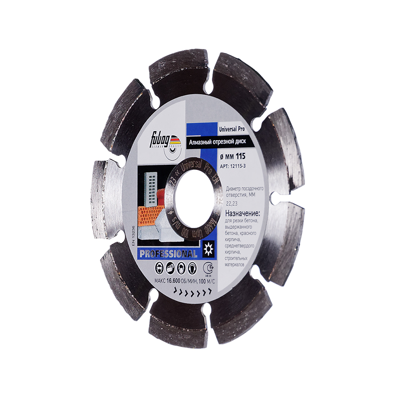 Алмазный отрезной диск Universal Pro Fubag является сменным элементом для угловых шлифовальных машин. Применяется для сухого реза бетона, выдержанного бетона, красного кирпича и различных строительных материалов. Высота сегментов — 7 мм.                                             Характеристики Алмазный отрезной диск FUBAG Universal Pro D115 мм/ 22.2 мм