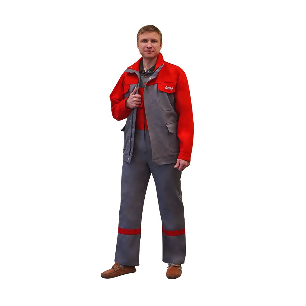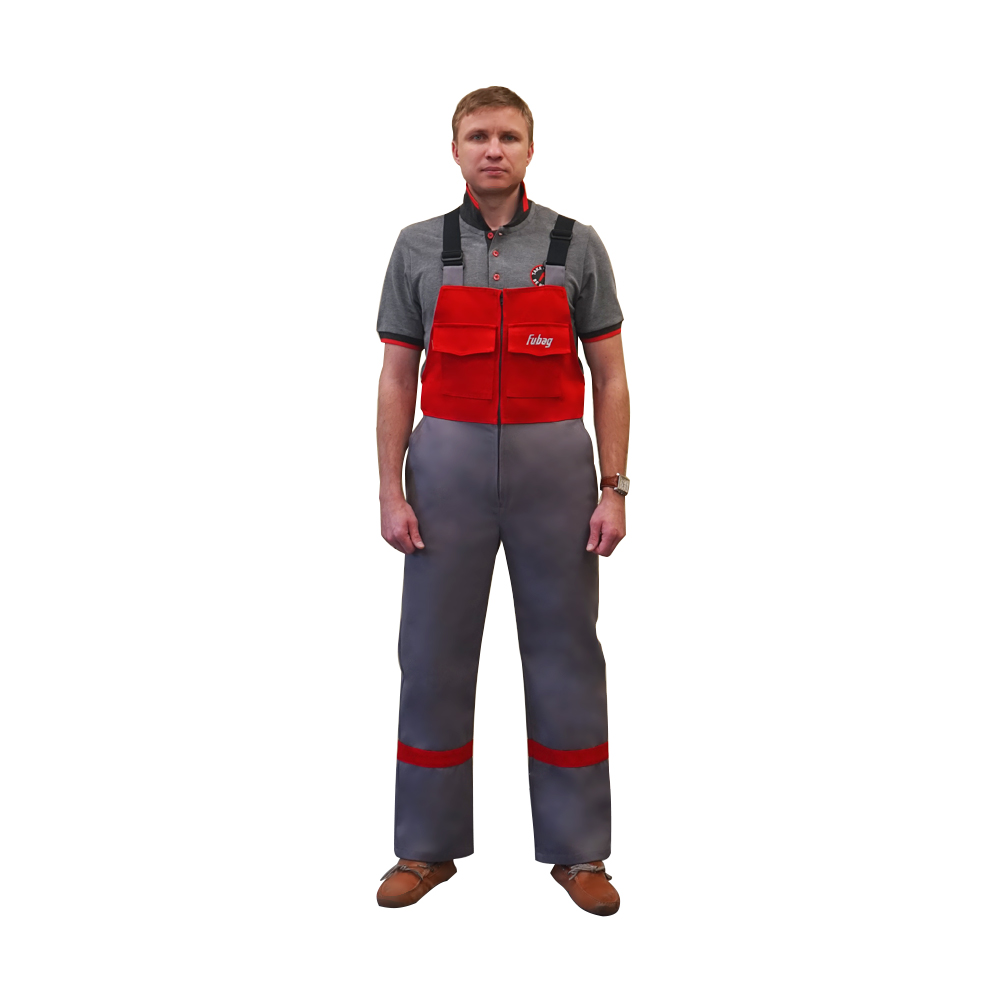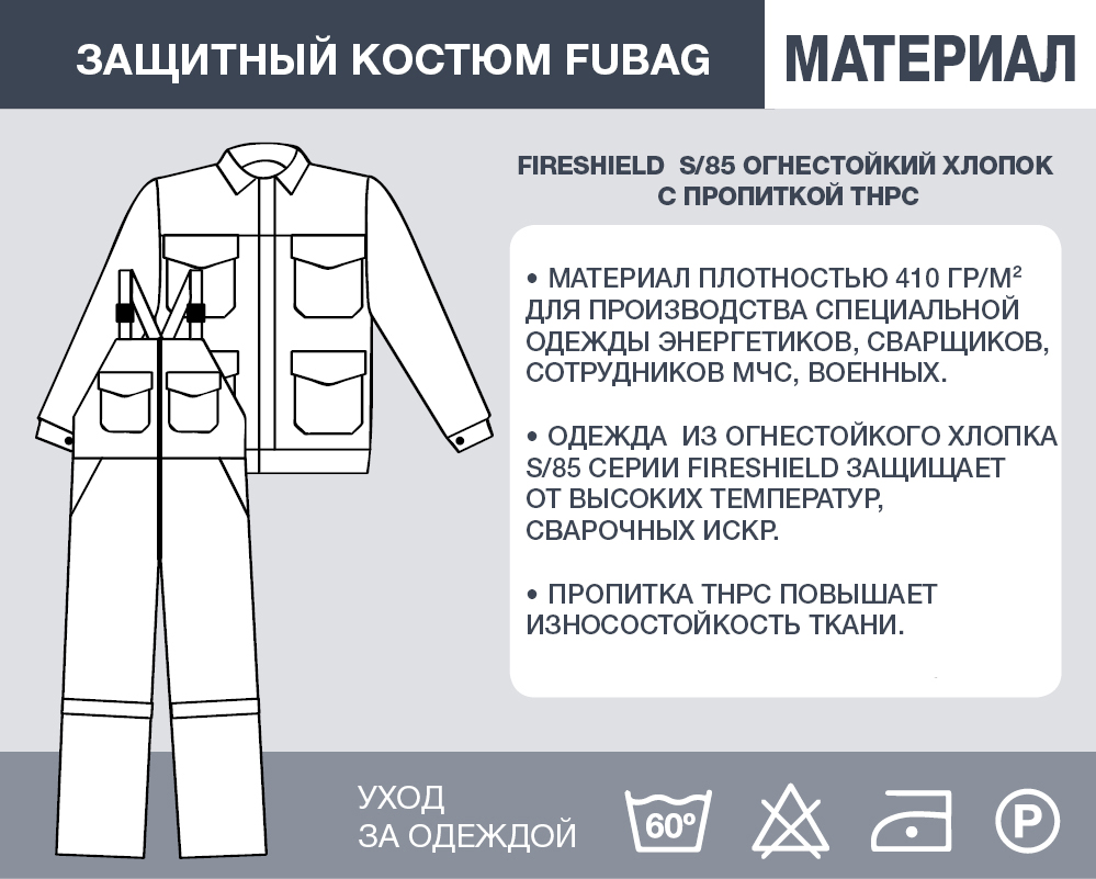 Состоит из полукомбенизона и куртки. Костюм сшит из огнестойкой хлопковой ткани Fireshield S/85 плотностью 410 гр/м?. Полукомбинезон на застежке-молнии и с резинкой сзади, позволяет принимать мягкую и комфортную посадку и подстройку под размеры тела.В модели, рзаработанной по индвидуальному лекалу, предусмотрены все элементы для удобной и безопасной работы: 4 накладных кармана с клапанами и застежками; регулировка ширины манжеты за счет надежной металлической кнопки; двойной воротничок с укрепленной стойкой.